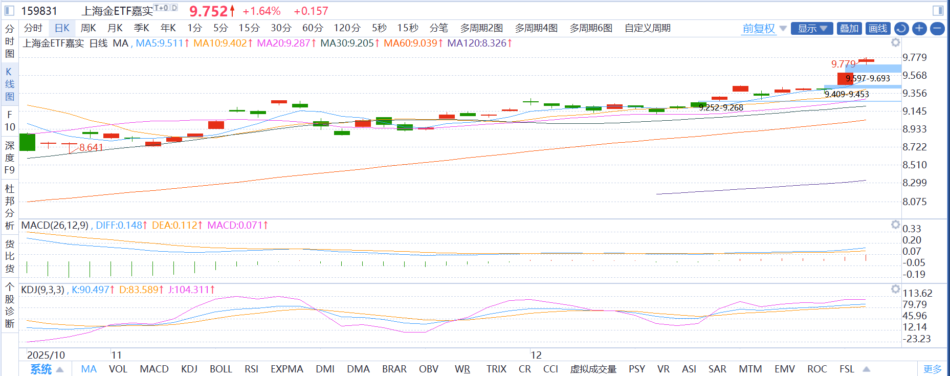 黄金板块:贵金属今天继续霸榜!上海金ETF沿着5日线陡峭上行,完全没有回头的迹象。MACD红柱持续放大,这是最强的主升浪形态。