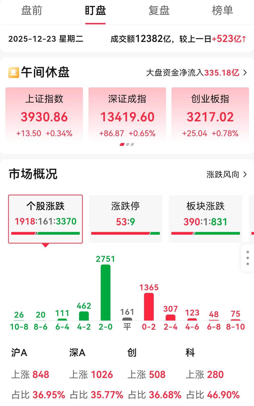 回到盘面,周二上午走得那是相当稳健。昨晚美股三大指数集体收涨,咱们大A也很给面子,三大指数全线飘红,创业板指更是涨了近0.8%。半日成交额飙到了1.23万亿,这量能,妥妥的又是两万亿级别的日子!