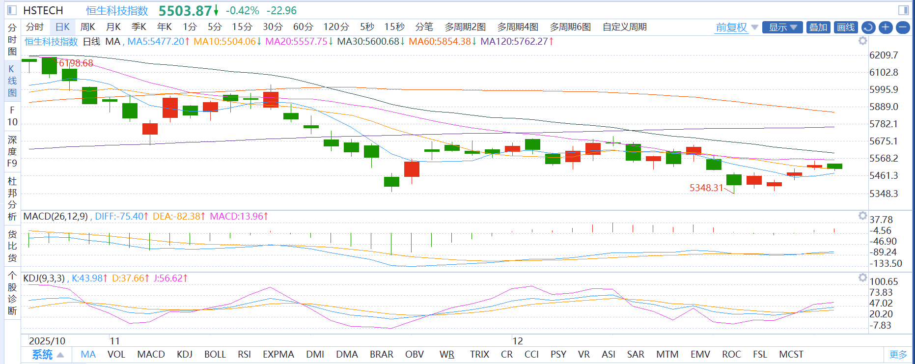 现在恒科指数在5514点附近磨合,正好踩在5日线和10日线上方,短期的支撑还是挺强的。前几天回踩5348点那个位子没破,基本可以确定那儿就是个阶段性的小底了;MACD虽然还在零轴以下,但绿柱子在缩短,这就是典型的“磨底修复”信号。