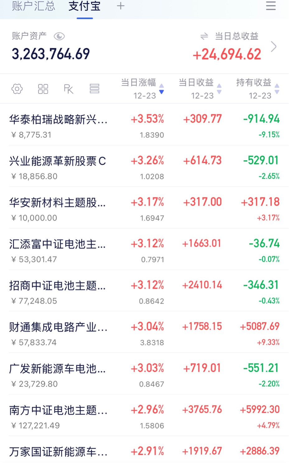 3. 新能源锂电池,上车5000,$汇添富中证电池主题ETF发起式联接C$ 虽然今天新能源锂电池平均上涨3%,但是从近三个月的位置来看,这一波最高跌了17%,筹码依旧便宜,新能源锂电池重新受到主力资金追捧,趁着反弹才刚刚开始,今天我追加5000