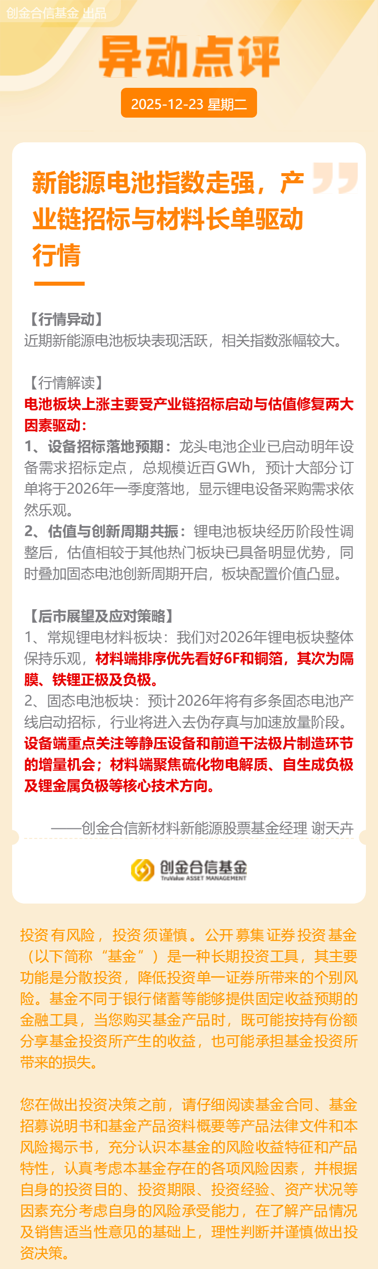 新能源电池指数走强,产业链招标与材料长单驱动行情