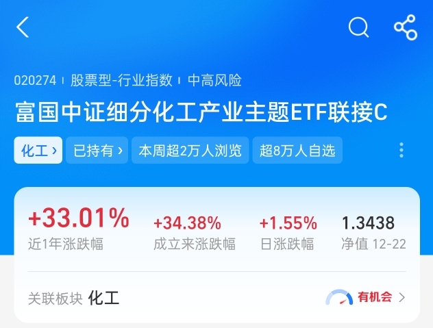 今天也是上车了$富国中证细分化工产业主题ETF联接C$ 通过联接对应ETF跟踪中证细分化工产业主题指数,布局聚焦化学原料、化肥、化纤、化工新材料等方向,完整覆盖化工产业链关键环节。该基金近期表现十分活跃,昨日净值上涨1.55%,今日午盘估值再次上涨;长期维度看,其近一年收益率突破33%,在主题类基金中表现突出。而化工行业作为传统产业升级与新兴材料发展的核心领域,在产业政策扶持和供需格局优化的双重驱动下,发展前景也被持续看好。