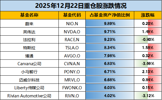 【十大持仓】根据最新披露的基金定期报告,截至2025年三季度末,华宝海外新能源汽车前十大重仓股包括蔚来、英伟达、法拉利、博通、特斯拉、Carvana公司、小马智行、迈威尔科技、Liberty传媒公司、Rivian Automotive公司,占基金资产净值比例合计为75.42%。