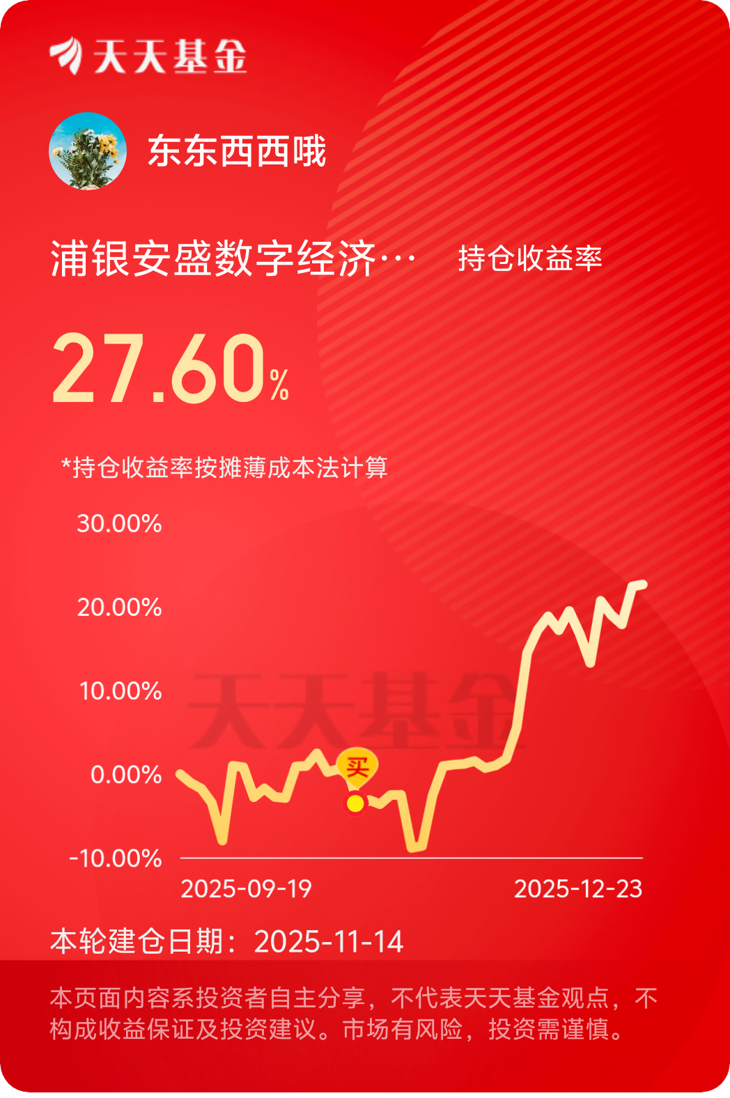 #长征十二号甲可复用火箭首飞引发关注# 浦银数字经济新基就是猛,11月上车到现在赚了20多个点了,看好你,加油吧,新基金规模小压力小干的猛后起之秀不可小觑,看了下基金经理李凡虽然年轻,但是深耕通信板块,近1月TOP的业绩已经证明他的能力和眼光了,跟定了别让我失望!$浦银安盛数字经济混合C$ #晒收益#
