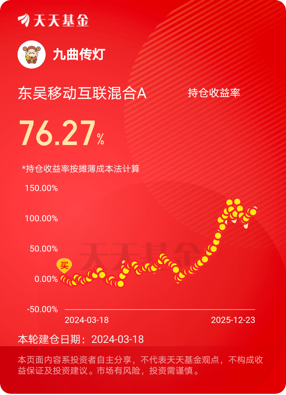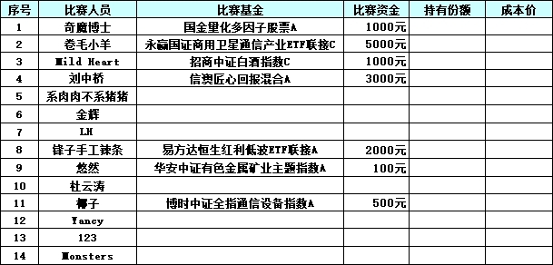 “传灯杯”养基比赛活动自2021年推出以来,受到朋友们的欢迎和关注,每年都有不少人想参加。限于比赛的特殊性,没法中间加入。 为满足大家的参与心愿,实现投资互动交流和共同提高,我们决定在2026年,继续举办2026第6届“传灯杯”养基比赛活动。 受制于组织能力的局限性,每届“传灯杯”养基比赛选手为十余人。第6届养基比赛通告发出后,总共有10多位朋友报名。确定选手时,主要以班群为单位,一个班1人,14个班群共14人,14人中,包括第5届养基比赛前三名。 选手确定后,组建了养基比赛活动交流群,组织选手们选定参赛基金,确定参赛资金或购买份数,目前有8名选手已完成,比赛准备工作已基本就绪。 2026年前三天刚好是元旦假期,然后4号我们虽然上班,但交易所不上班,实际第一个交易日是1月5号。所以,各位选手可以从1月5号开始,按照自己确定的基金和金额进行买入,正式开赛。 ———参赛选手情况 1、奇魔博士(1班,学生):比赛资金:1000元,基金:国金量化多因子股票 2、卷毛小羊(3班,教师):比赛资金:5000元,基金:永赢国证商用卫星通信产业ETF联接C 3、Mild Heart(5班,技术人员):比赛资金:1000元,基金:招商中证白酒指数C 4、刘中桥(2班,食品加工):比赛资金:3000元,基金:信澳匠心回报混合A 5、系肉肉不系猪猪(4班,事业单位):比赛资金:**元,基金:** 6、金辉(6班,行政单位):比赛资金:**元,基金:** 7、LH(7班,国企职工):比赛资金:**元,基金:** 8、锋子手工辣条(11班,餐饮行业):比赛资金:2000元,基金:易方达恒生红利低波ETF联接A 9、悠然(12班,行政单位):比赛资金:100元,基金:华安中证有色金属矿业主题指数A 10、杜云涛(10班,企业员工):比赛资金:**元,基金:** 11、椰子(8班,企业员工):比赛资金:500元,基金:博时中证全指通信设备指数A 12、Yancy(0班,IT公司):比赛资金:10000元,基金:银华海外数字经济量化选股混合(QDII)A 13、123(13班,自由职业):比赛资金:**元,基金:** 14、Monsters(9班,自由职业):比赛资金:**元,基金:** ———比赛规则 1、比赛从2026年第一个交易日开始,参赛人员自行决定首次买入时间,按确定比赛资金或购买份数,一次性买入参赛基金。 2、比赛期间可以买卖、空仓,也可以换成另外一支基金。买卖、换基需全仓操作,以降低管理难度,确保资金的连续性。 3、首次买入后,比赛中间可以买卖、换基3次,即总共可做4次操作。每月只允许操作一次,比如2月份卖出后,只能3月份或之后月份再买入。 4、比赛截止时间为2026年11月。前三名参赛选手将有红包奖励。 5、每月第三周,参赛人员将参赛基金的业绩和感悟发交流群里,经编辑后形成每月赛事文章。 6、比赛期间,参赛选手可以结合自身投资实践或赛期感悟,撰写投资类文章编发。 ———天天账户 2024年3月18日起,开始在天天基金买入基金,共持有基金2只;周二,融通健康产业买入250元,累计买入42750元。 现基金资产59966.64元,盈利17216.64元。其中,融通健康产业收益率为4.75%、东吴移动互联混合A收益率为76.27%。 备注:一位坚持基金投资19年的老司机,持续全网发文6年,致力于分享基金投资科学理念。 $融通健康产业灵活配置混合A/B$ $东吴移动互联混合A$ #晒收益#