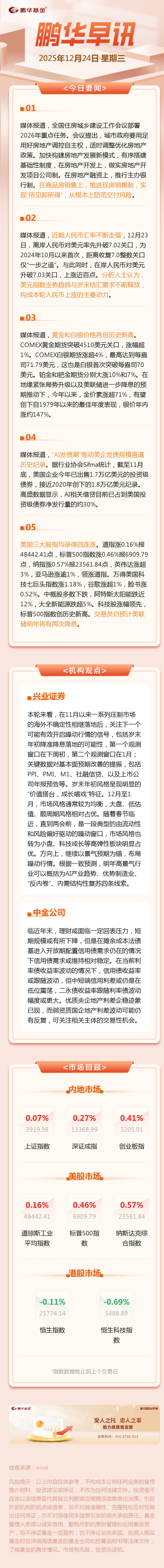 鹏华早讯12.24 住建部部署2026年楼市工作,推进现房销售制