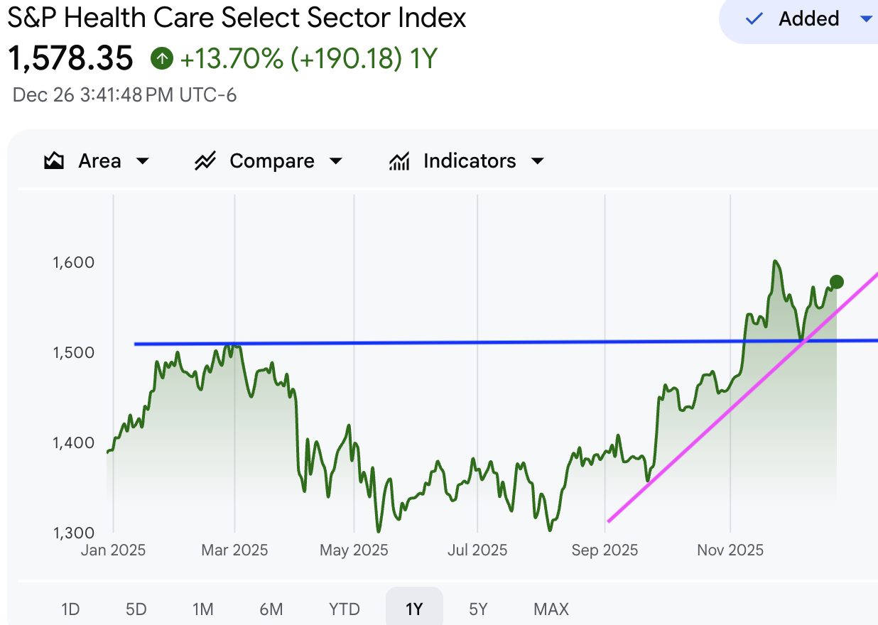 标普健康保健板块:在经历了一段高位盘整期后,K 线已成功在关键的上升趋势线附近获得有效支撑。这一回踩动作初步确认了底部支撑的有效性,暂时缓解了此前的破位风险,目前指数呈现出清晰的止跌企稳信号。若后续成交量能有效配合,该板块有望依托当前的趋势线开启新一轮的上行轨道。