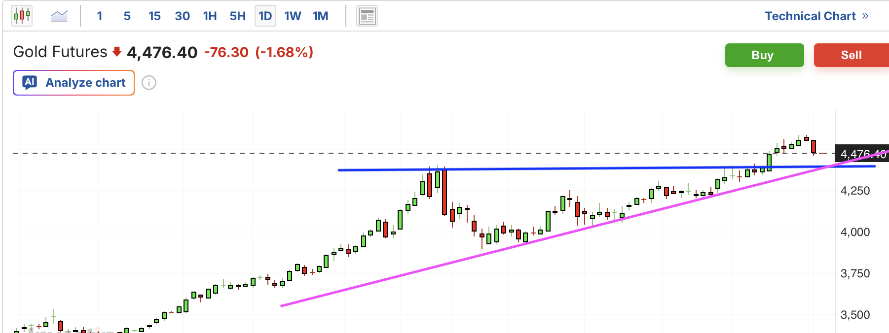 黄金:目前报 4,476.40 点,今日下跌 -1.68%。在经历强力反弹后出现高位回踩,K线目前正处于上升趋势线上方的强势震荡区间。虽然今日有所回调,但价格仍站稳在前期压力位转化而成的支撑区之上,多头格局尚未破坏。