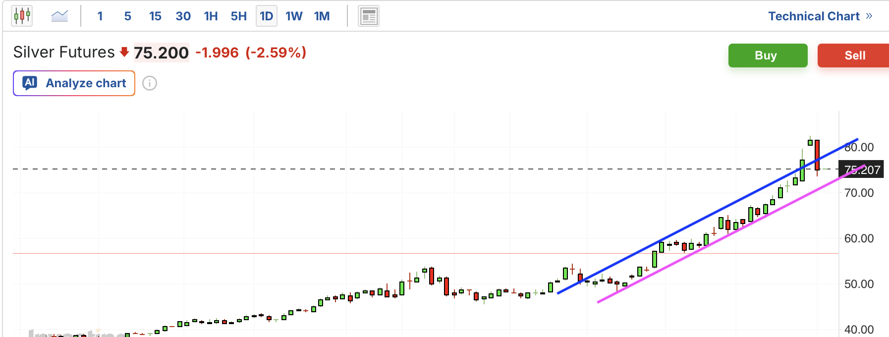 白银:目前报 75.200 点,今日下跌 -2.59%。白银在加速冲高后触发了技术性修正,K线正回踩此前陡峭的上升引导线。由于短期拉升斜率过大,目前正处于高位波动的风险释放期,需观察在支撑线附近的企稳力度。