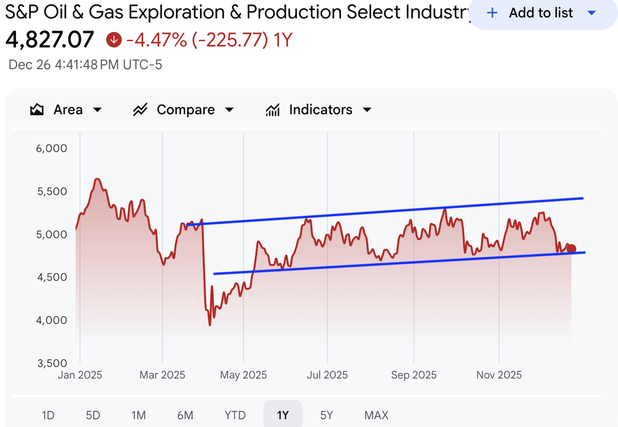 标普石油天然气开采指数(XOP):指数目前在关键的箱体下轨支撑线附近徘徊,处于多空博弈的关键节点。需高度警惕,若无法守住当前的支撑线,指数可能面临进一步下探寻求支撑的压力。