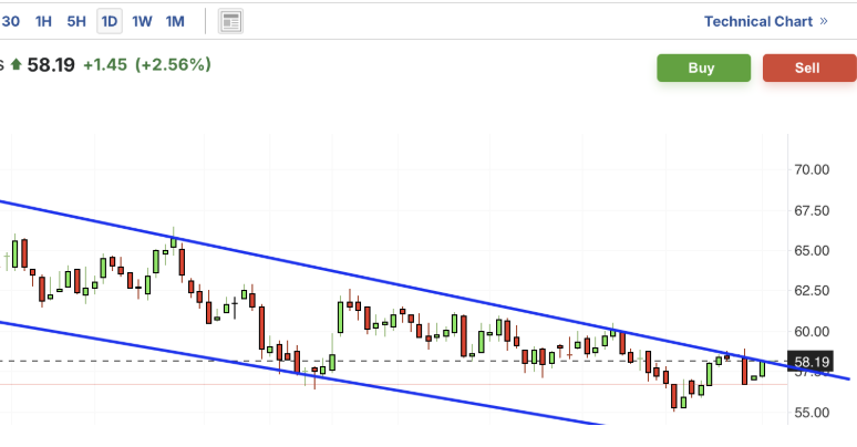 WTI原油期货:目前报 58.19 美元,今日上涨 +2.56%。目前K线在触及下降通道下轨后展开了明显的反弹,目前正尝试向上挑战通道上轨的压制。虽然整体仍处于下降通道中,但今日的强力反弹显示出多头正在低位积极尝试扭转此前的颓势,重心有所回升。需关注后续能否放量突破下降通道的上轨阻力,若能成功站稳,则有望摆脱长期的下行趋势。