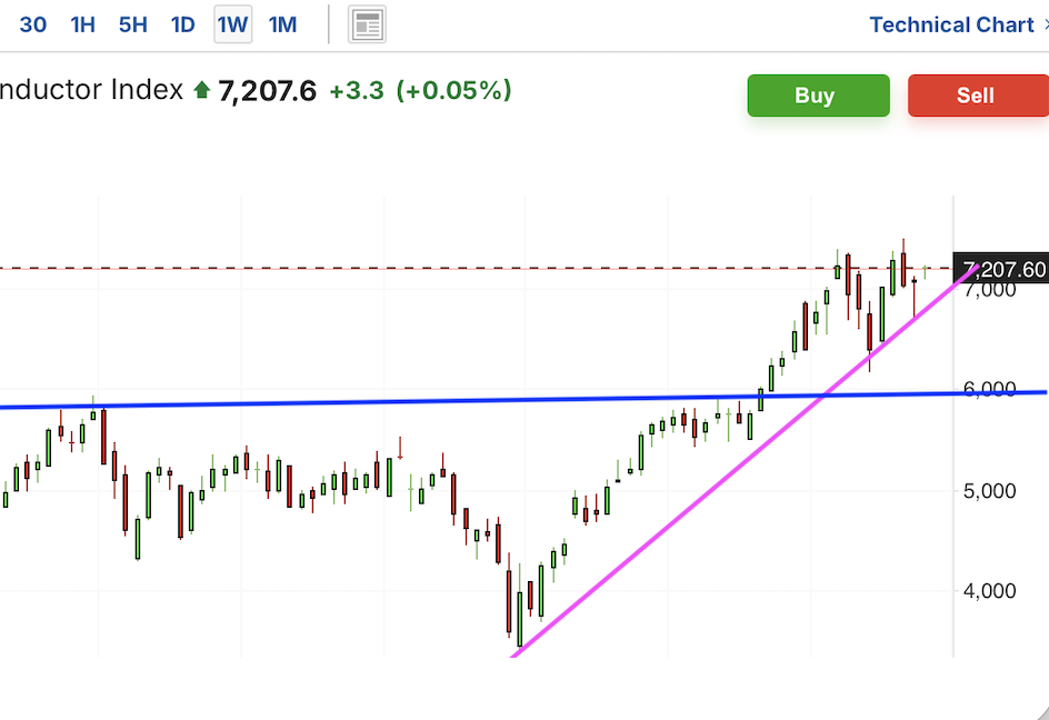 费城半导体指数(SOX):表现较为凌厉,在经历 12 月中旬的洗盘整固后,通过回踩确认支撑开启了上攻模式。指数正从“震荡筑底”转向“趋势扩张”,K 线已稳步站上上升趋势线并尝试突破前期高位压力位。目前指数处于上升通道的中上部,需关注能否放量站稳压力位。若能有效突破蓝色压力线,上行空间将进一步打开。