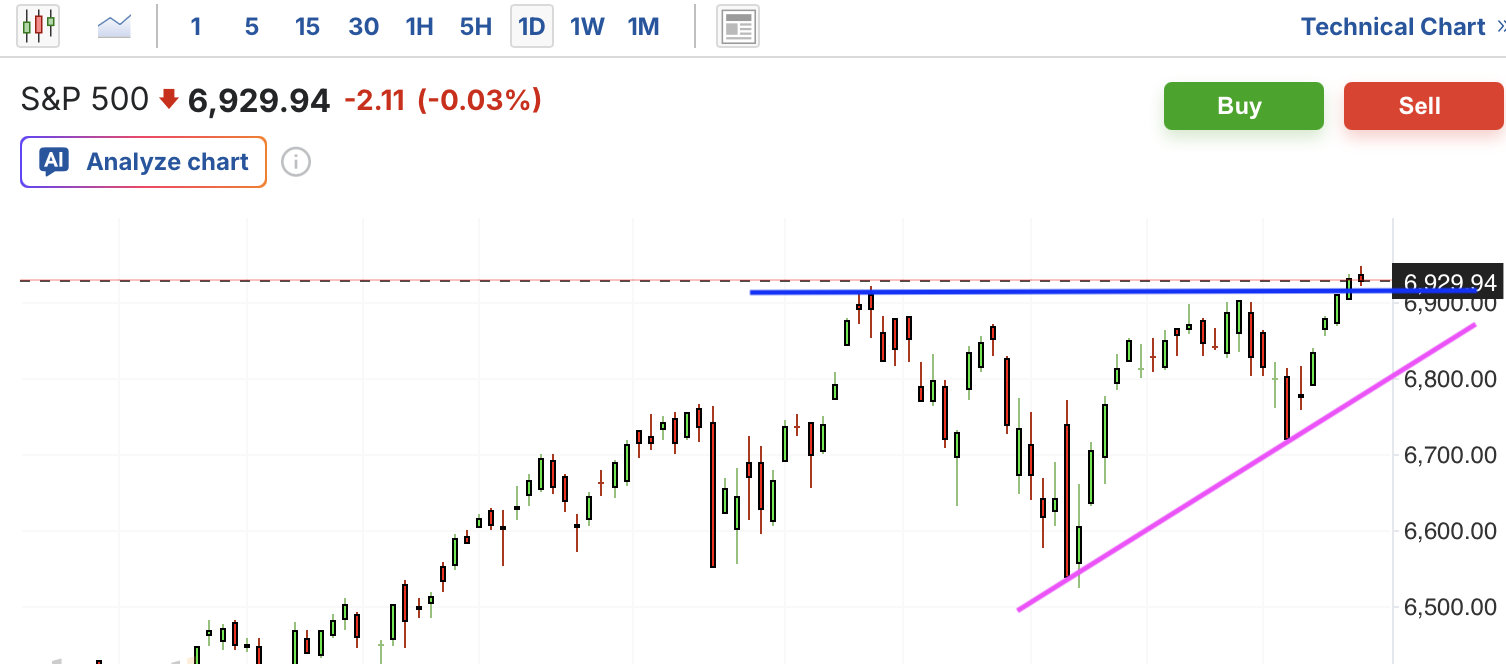 标普500指数(S&P 500):处于刷新历史纪录后的蓄势阶段,此前的上升通道上轨已转化为强支撑,目前的股价重心已显著高于前期的震荡箱体上沿。重心持续上移,多头正沿着紫色上升引导线稳步推升,呈现出典型的年终冲刺主升浪形态。