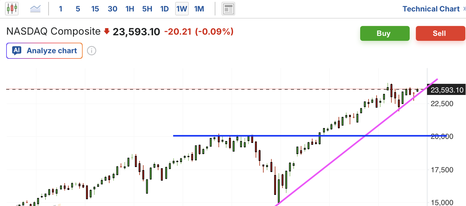 纳斯达克指数:整体依然维持在上升通道内。紧贴上升趋势线运行,且明显站稳在前期横向压力位之上,显示出极强的多头惯性。在突破“对称三角形”后,目前的走势更倾向于高位强势整理,只要不破位下方的紫色趋势支撑线,上涨逻辑依然成立。