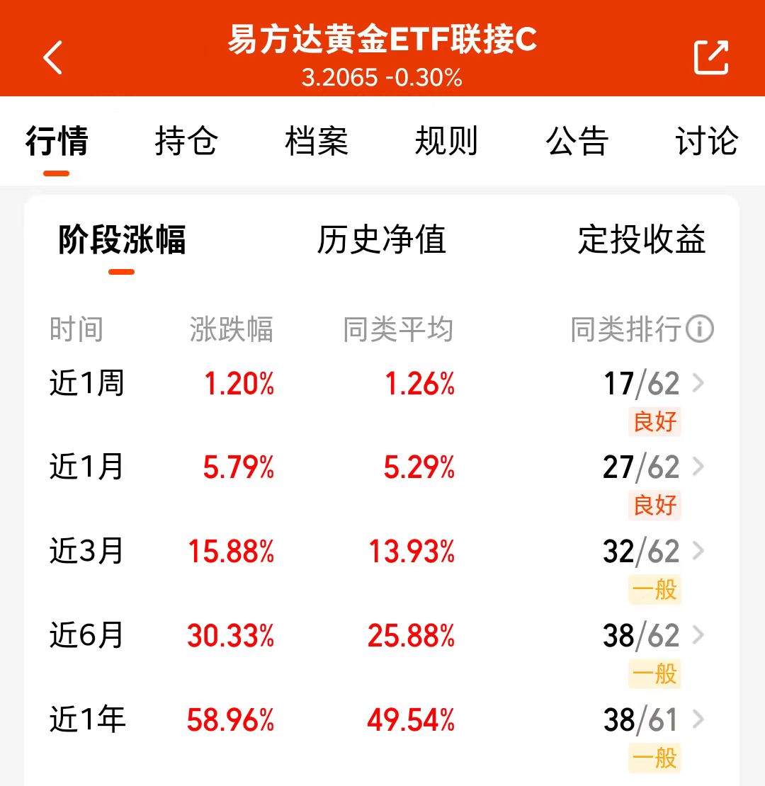 今天股市行情震荡,黄金也小幅回调,我继续加仓易方达黄金ETF联接C,回调就是加仓机会,大跌大加,小跌小加,低吸性价比更高呢。而且从长期来看,黄金长期价值更有韧性,核心配置需求不变,我继续加仓啦。