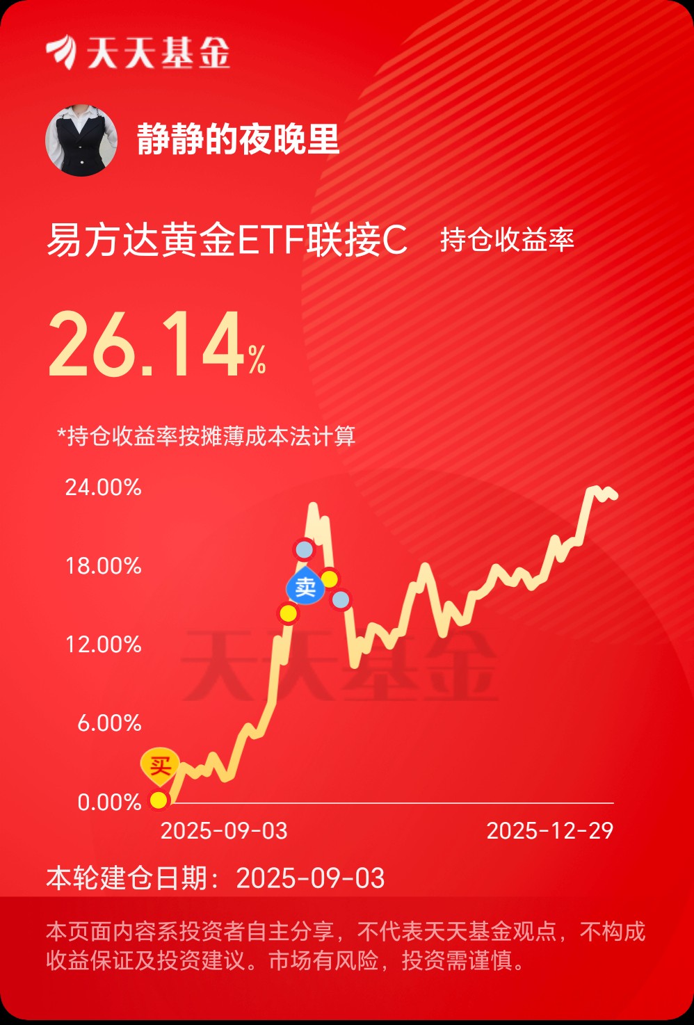 今日黄金板块迎来回调趋势,但也刚好释放了,近期持续上涨的风险,短期波动反而给了我加仓机会,而从中长期角度来看,支撑黄金上涨的底层逻辑并未改变,所以我继续定投$易方达黄金ETF联接C(OTCFUND|002963)$不但其规模大、同时背靠大厂,我的持有收益率也有26.14%,我也将持续看好啦!