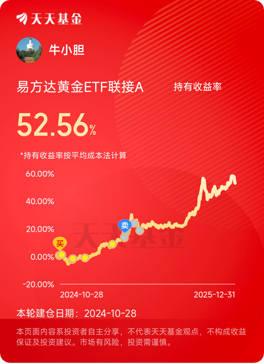 对我而言,2025年最宝贵的投资收获,从来不是易方达黄金ETF联接A赚了多少钱,不是这52.6%的收益率有多耀眼,而是我终于摆脱了曾经那个浮躁、盲从的自己,学会了从容持仓,学会了理性应对波动,学会了在诱惑面前坚守本心,在压力面前坚定信念。
