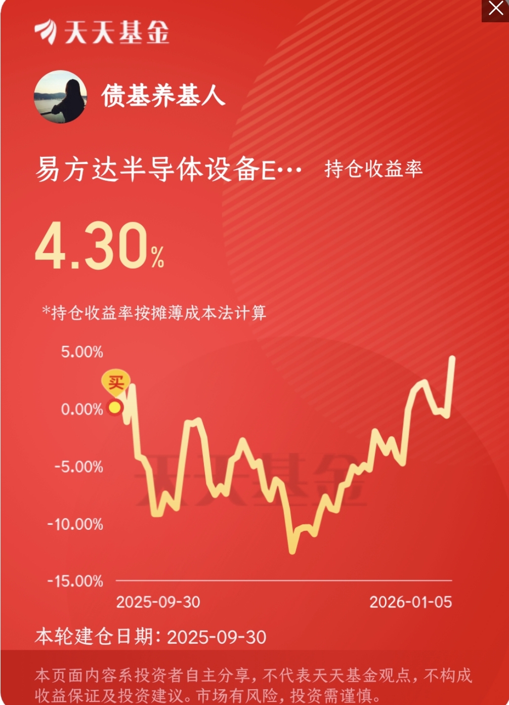 今日股市全面上扬,迎来开门红,半导体设备板块表现尤为抢眼。板块内多数个股强势上涨,市场情绪积极。这主要得益于行业景气度回升,以及相关政策利好的持续推动。我持有的易方达半导体设备ETF联接C今日上涨4.99%,我的持有收益率也达到了4.3%,耐心等待,继续持有!