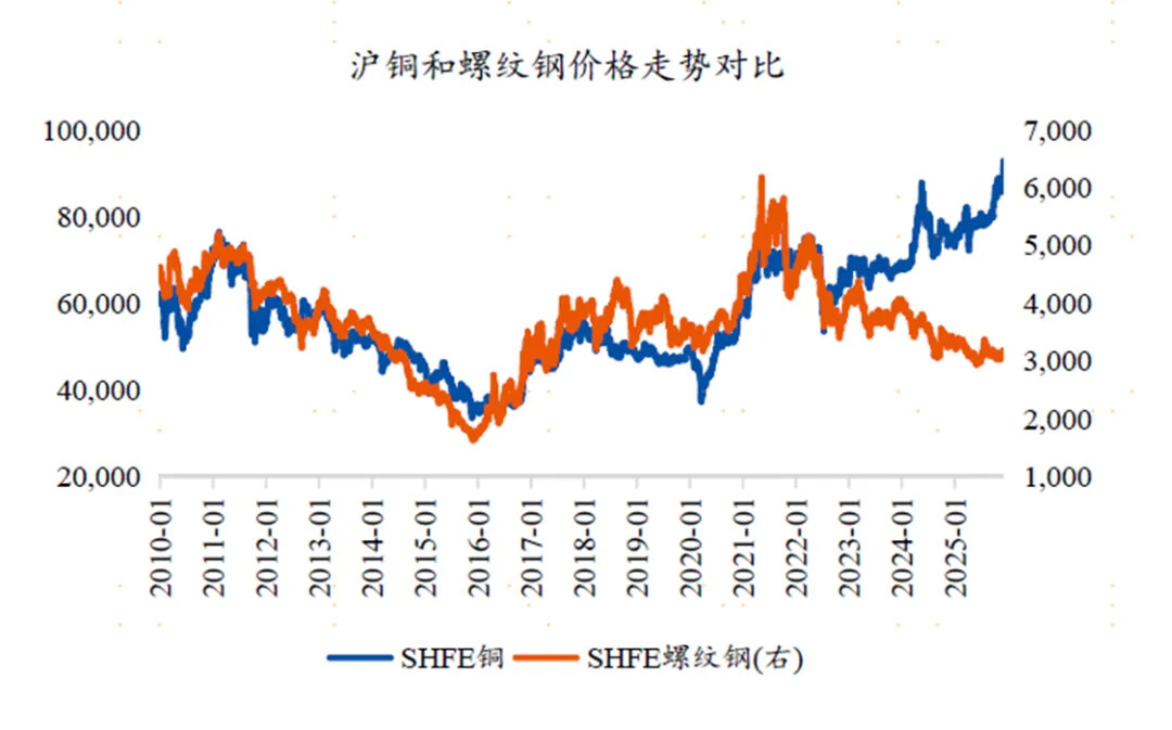 在商品市场上看到也是类似的结构,比如说铜和钢的分化,今年的分化可以理解铜价反映新兴产业的趋势,特别是今年的铜价趋势和美国数据中心的建设非常有关系的。在美国内部AI的繁荣推动了铜价的上涨,但是非AI的疲弱在一定程度上对冲了这部分的影响,导致通胀预期是在走平的。这是经济的叙事在资产价格上的大的影响。