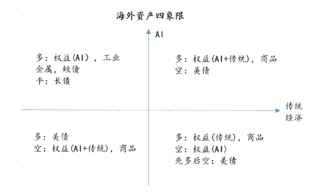 如果按照AI和传统经济的发展趋势,可以简要区分为四象限,那么很显然2025年海外资产的表现就处在左上的象限中。