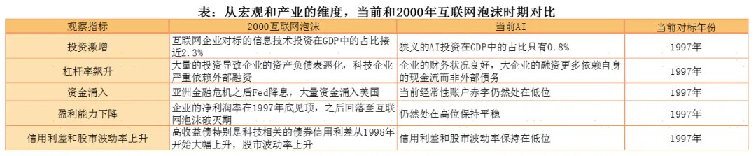 在阿尔法上的叙事,目前有大量的人都在讨论AI的泡沫问题。现在从大量的监测数据来看,如果要和2000年的互联网泡沫做对比,目前大量的客观数据对应的是AI产业,相当于1997年到1998年的互联网泡沫时期。在这个位置去谈泡沫马上要破灭,可能还是相对比较早期的论断,但未来AI的波动可能上升。