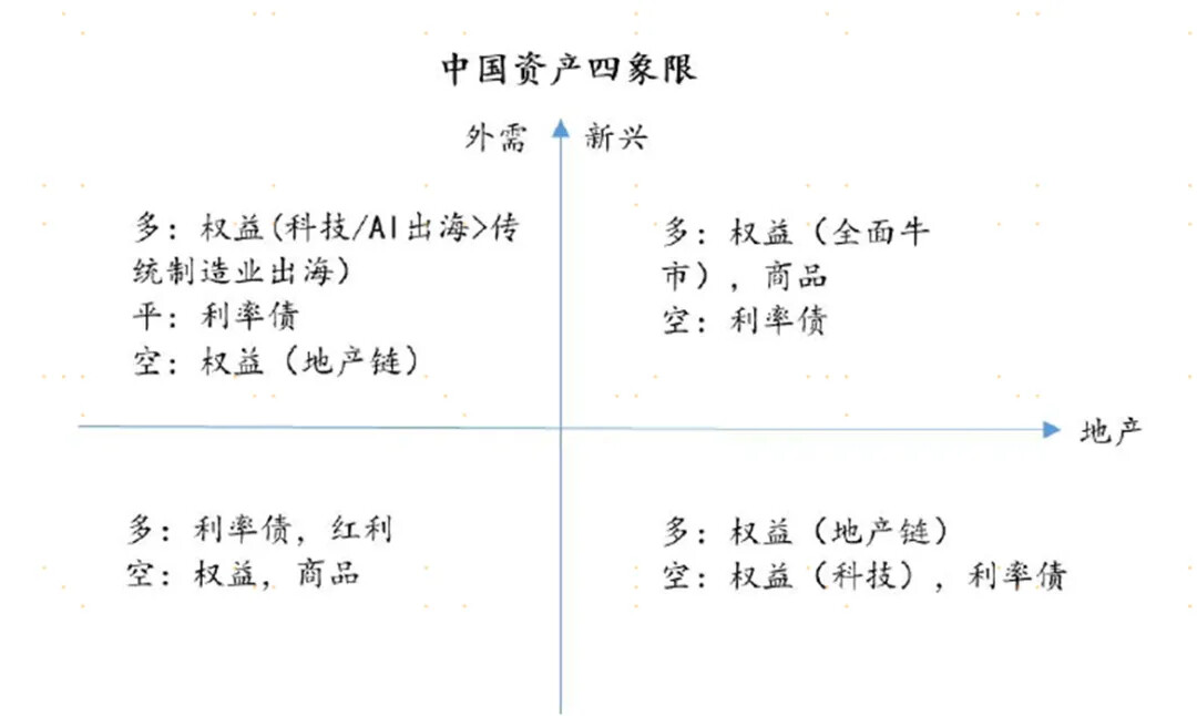 参照海外市场的情况,中国资产2025年的表现其实也处于左上的象限中,对应的是外需新兴好和内需地产弱的结构。