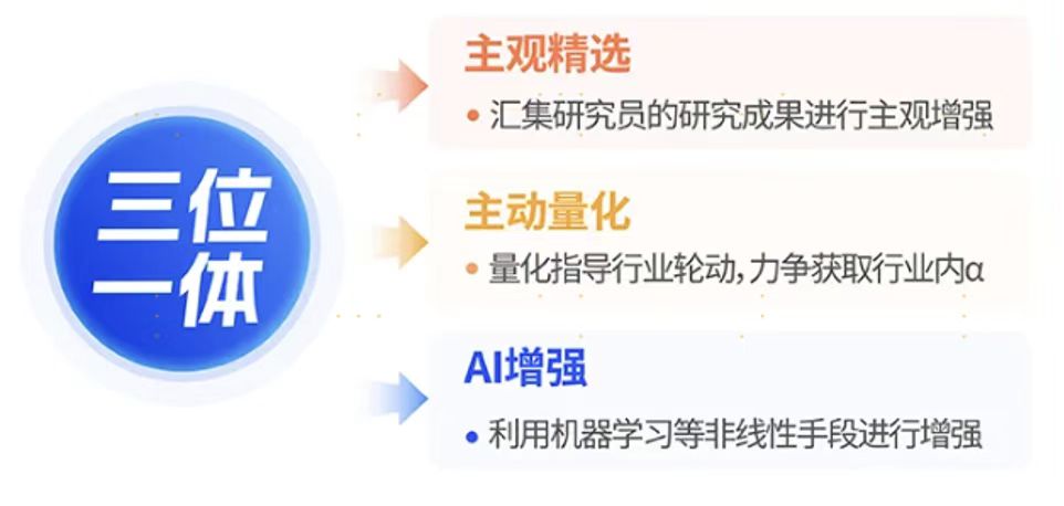 主动量化则是采用行业轮动轮动框架筛选每期适配行业后,再基于行业研究员的模拟组合获取行业内Alpha。同时,AI增强的选股框架则是新产品运作体系的重要构成部分,大量使用非线性手段对研究团队模拟组合选股池进行增强,提升组合选股精度。