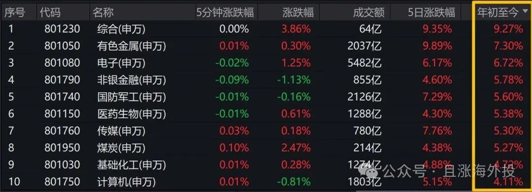 今天想跟大家聊一下,2026年头三个交易日,我们能从中看到一些什么端倪?我拉了一下相关的数据,目前31个申万一级行业当中,涨幅靠前的前10个行业。