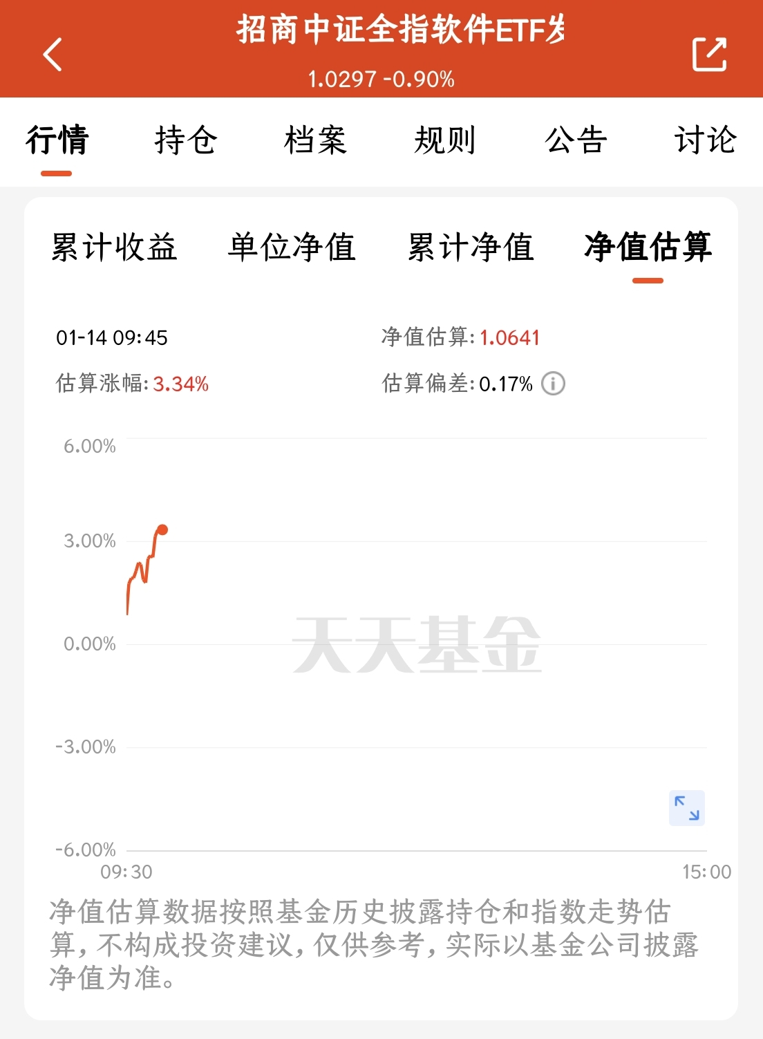 昨天股市外围小幅调整之后,今日高开高走,行情向好。鉴于年底数字经济发展及春节前传媒游戏板块的潜在利好,我打算提前布局$招商中证全指软件ETF发起式联接C(OTCFUND|018386)$,有望把握GEO兴起机遇。该基昨天小跌,今日估值大涨,目前估值3.34%,有望反包,近一周涨幅10.48%,近一个月上涨20.35%,厉害了!