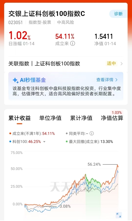 观察交银上证科创板100指数C的业绩表现,近一年涨幅54.11%,大幅领先同类平