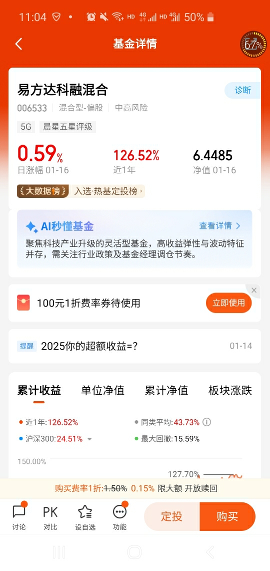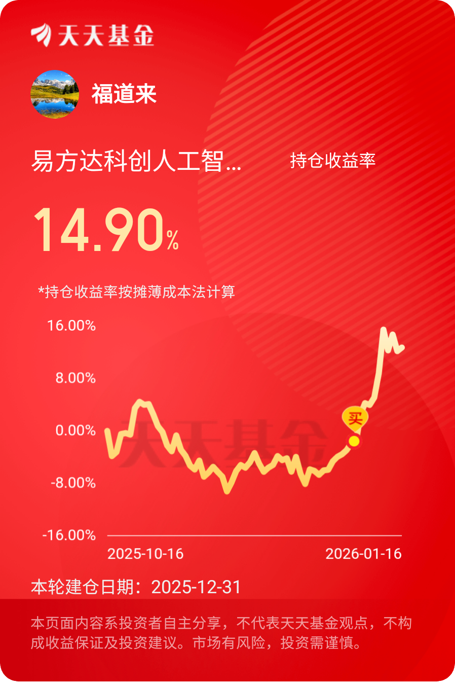 我已持有$易方达科创人工智能ETF联接C(023565)$,到今天已有14.9%的收益,非常满意。接下来就是持续学习,均衡配置,定投买入,期待2026年可以打一个翻身仗!@易方达基金