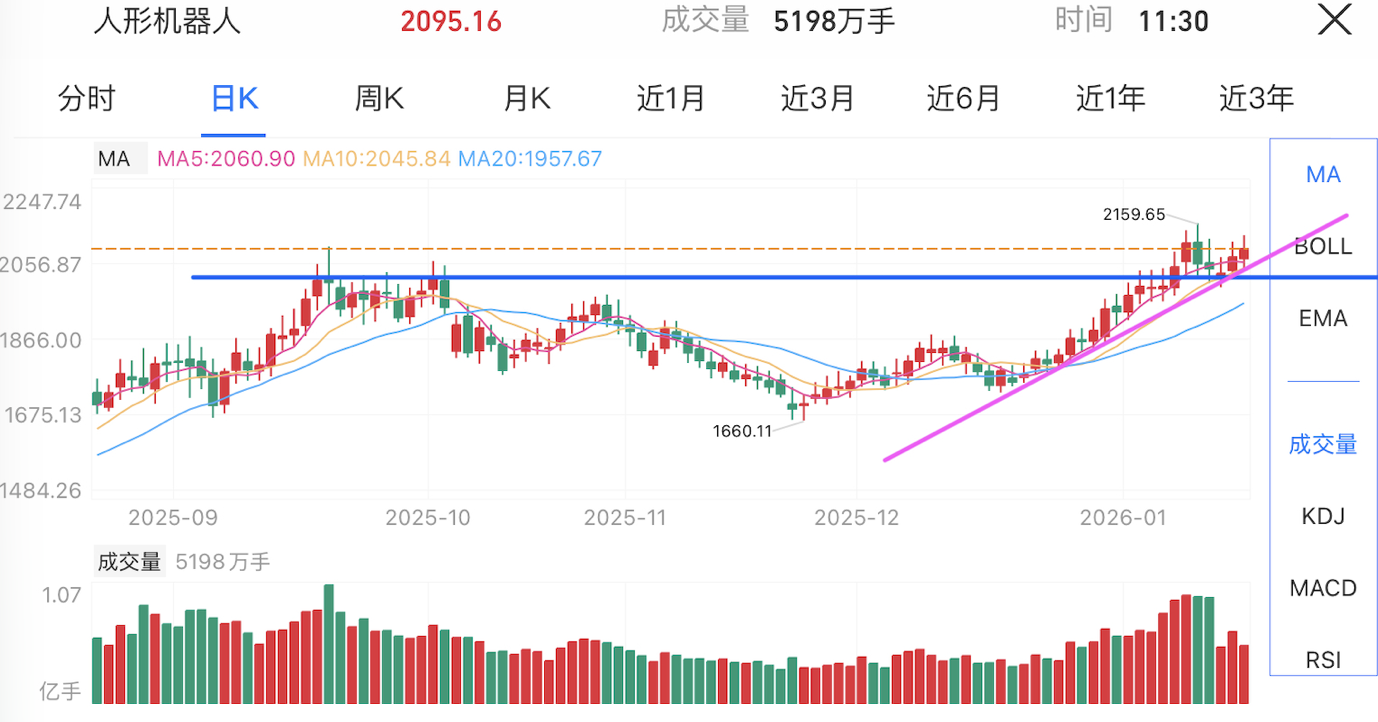 人形机器人:板块在完成“V型”反转后进入前高压力区,近期呈现出缩量整固的态势。尽管存在超买后的回调压力,但均线多头排列提供了较强的安全垫。 关键在于能否在压力位附近横盘消化卖压,守住支撑线即为强势。