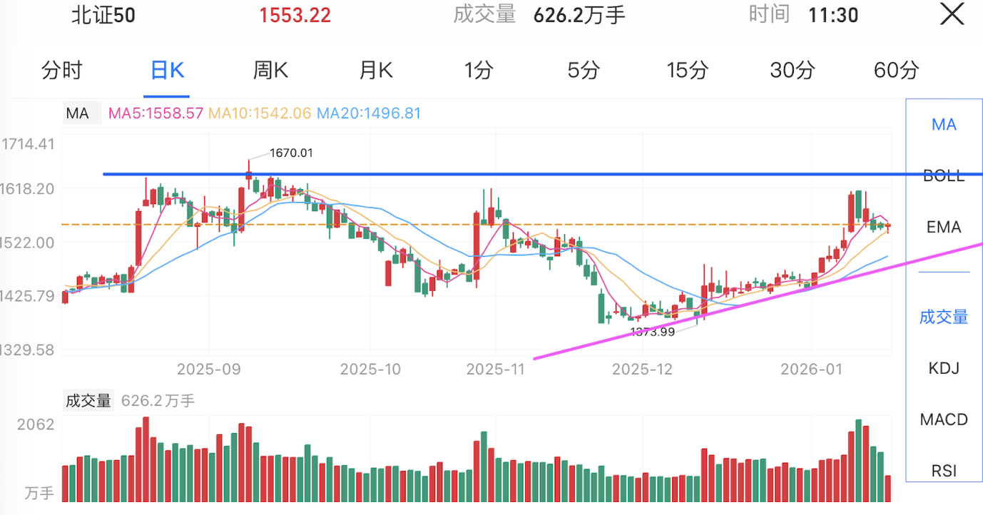 北证50:指数成功跨越下降通道压力,形成清晰的底部抬升态势,成交量呈阶梯式放大的良性信号。目前K线正围绕布林线中轨进行震荡洗盘,这种良性回踩有助于消化获利盘。 坚守突破口附近的支撑位是关键,蓄势后有望开启新一轮上攻。