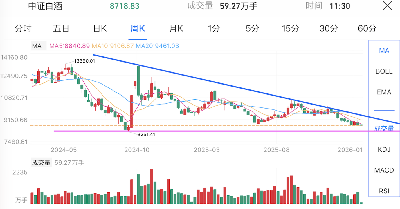 白酒:股价目前在下降趋势线末端的底部区域徘徊,成交量已萎缩至历史极低水平。极低量能通常预示空头动能枯竭,板块进入磨底后期。 需密切关注放量长阳的出现,一旦收复短期均线,则是明确的趋势扭转信号。