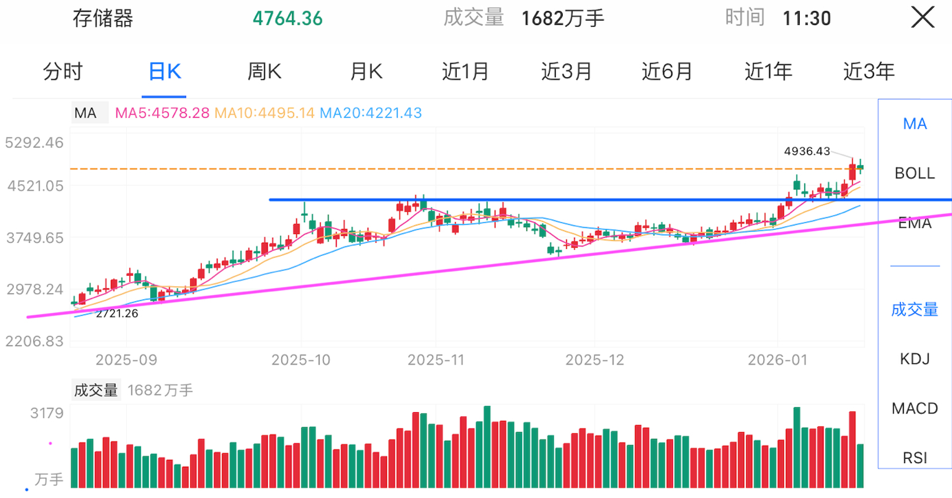 本人今日加仓5000。美股半导体再度走强,存储与设备领涨,台积电上调资本支出释放出需求加速信号,直接利好国产半导体设备出货。存储+设备有望成为最强主线之一。近期存储行业景气度快速上行,资本开支扩张显著提升上游设备商盈利确定性。在科技自主背景下,先进制程设备国产化与存储器国产替代空间持续打开。技术面看,存储器已突压力位,均线多头排列,成交量明显放大。该基重点布局存储龙头与设备核心,风格与当前主线高度契合,进攻性突出,业绩居前,回踩即机会。