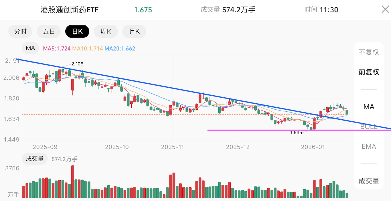 创新药(港股通创新药): 成功放量突破长期下行压力线,标志着大级别下降通道的终结,目前已稳步进入右侧交易区。尽管随大盘出现窄幅震荡,但 K 线仍受布林线中轨支撑,多头格局未变。 当前的整理更多是技术性修复,回踩不破中轨仍可视为良性的蓄势过程。