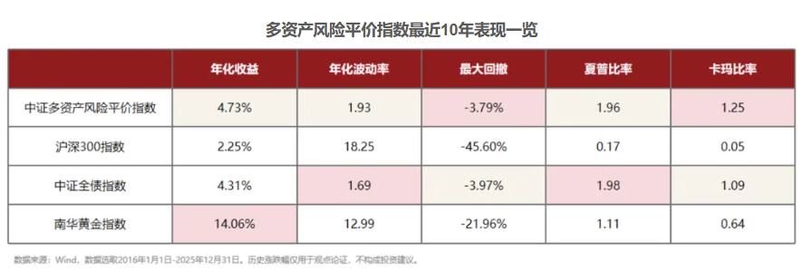 以代表多资产配置的中证多资产风险平价指数为例,该指数由A股、债券、黄金三类核心资产构成,从指数近10年表现来看,最大回撤仅为-3.97%,不仅显著低于中证全债指数代表的债券类资产,更大幅优于沪深300指数代表的权益资产、南华黄金指数代表的商品资产,展现出极强的抗风险能力。