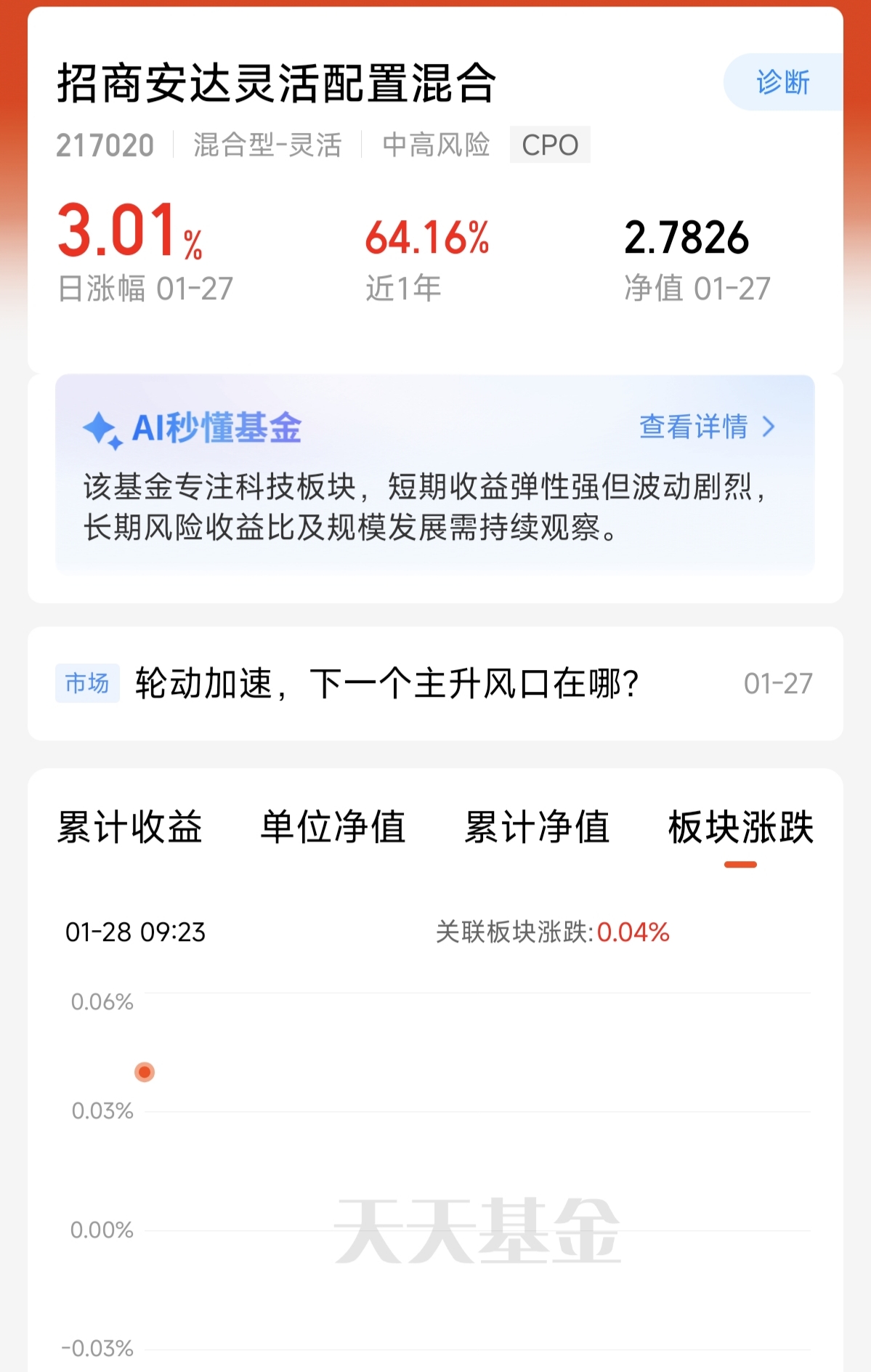 昨天股市行情反弹,在债市企稳的基础上可转债收益不错呢,跨年行情余温还在,春季行情更值得期待。招商安达灵活配置混合昨天上涨3.01%。近一年上涨64.16%。业绩能力强。