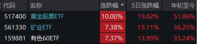 现货黄金价格加速上冲站上5200美元/盎司整数关口,黄金股票、有色金属板块大涨。截至收盘,SSH黄金股票(931238.CSI)指数单日涨7.87%、有色矿业(931892.CSI)指数单日涨6.68%、国证有色(399395.SZ)指数单日涨6.31%。