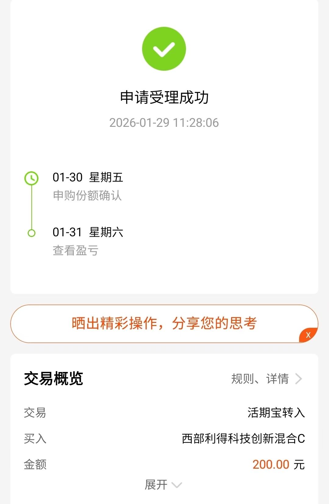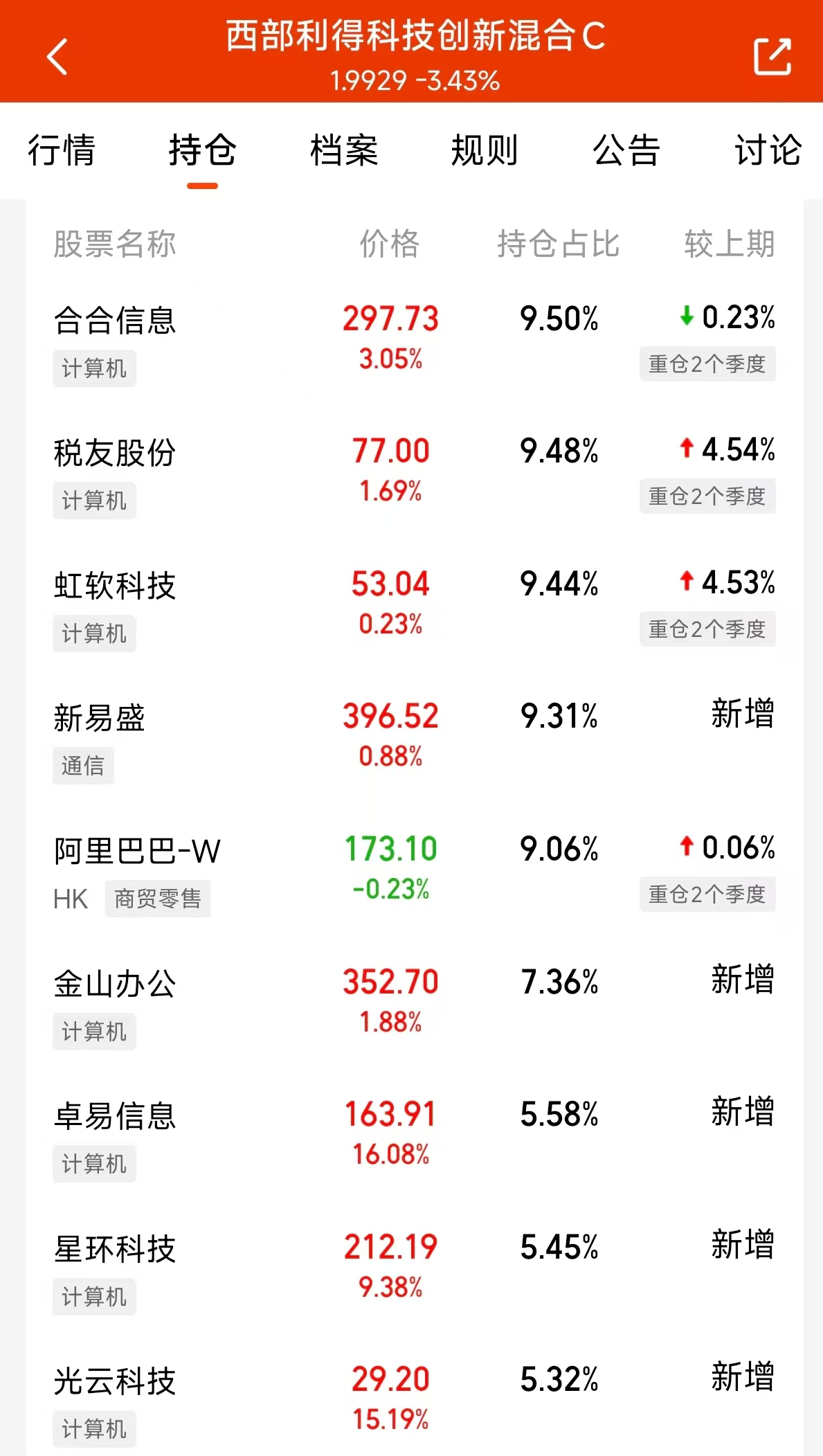今天股市行情继续上涨,AI算力与应用板块全线拉升,今天又在市场里领涨啦,我关注的$西部利得科技创新混合C(OTCFUND|020065)$重仓股今天涨幅都比较大呢,现在AI应用发展快速布局症当时呢,而且近期利好也比较多,我先继续加仓啦。