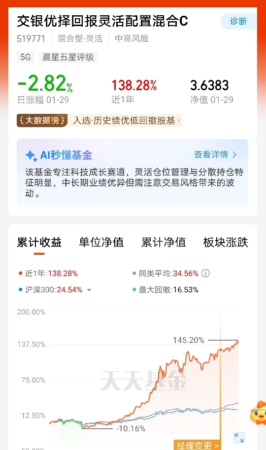 交银优择回报灵活配置混合C聚焦科技成长赛道,深度布局AI算力等硬核科技领域,在AI算力需求爆发与国产替代提速的双重驱动下,相关板块成长空间持续打开;同时搭配周期板块布局,在周期景气度回升阶段可分享复苏红利。该基金近1年收益表现亮眼,获晨星五星评级,为中高风险偏好者提供兼具成长与弹性的配置思路。