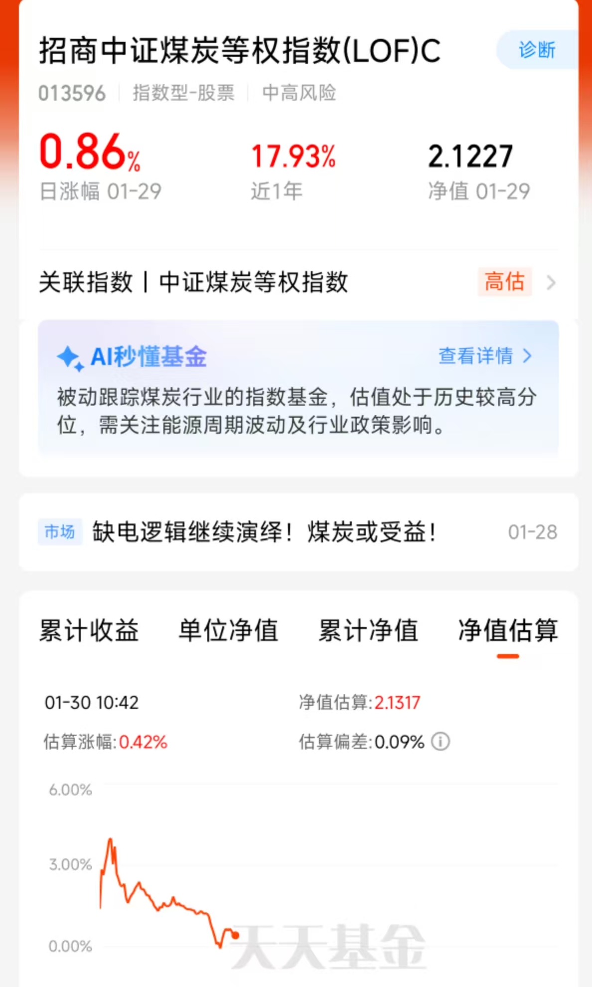煤炭作为能源板块重要部分,在供给约束强化,需求边际改善的双重利好下,煤炭价格上涨,最近涨出了新高度,煤炭中证煤炭等权指数(LOF)C昨天上涨0.86%,超过了前期的电力等热门板块,期待继续上涨。