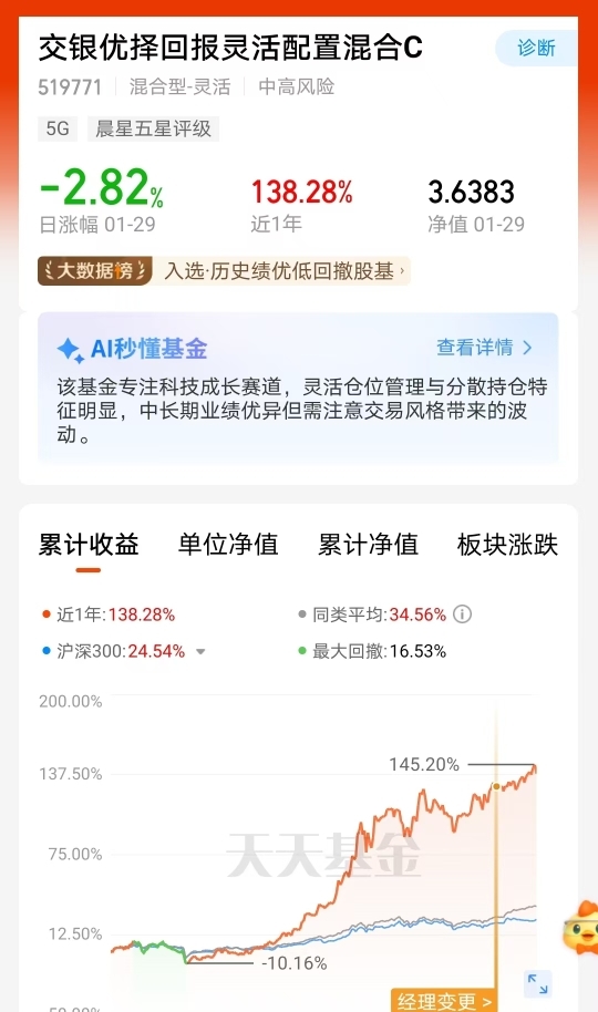AI产业商业化落地进程加快,科技产业链价值持续凸显,交银优择回报灵活配置混合C以科技为核心布局细分领域,深度挖掘产业升级机会;同时搭配周期板块,在复苏周期中捕捉收益增量,近1年收益表现突出,为资产配置提供了多元方向。