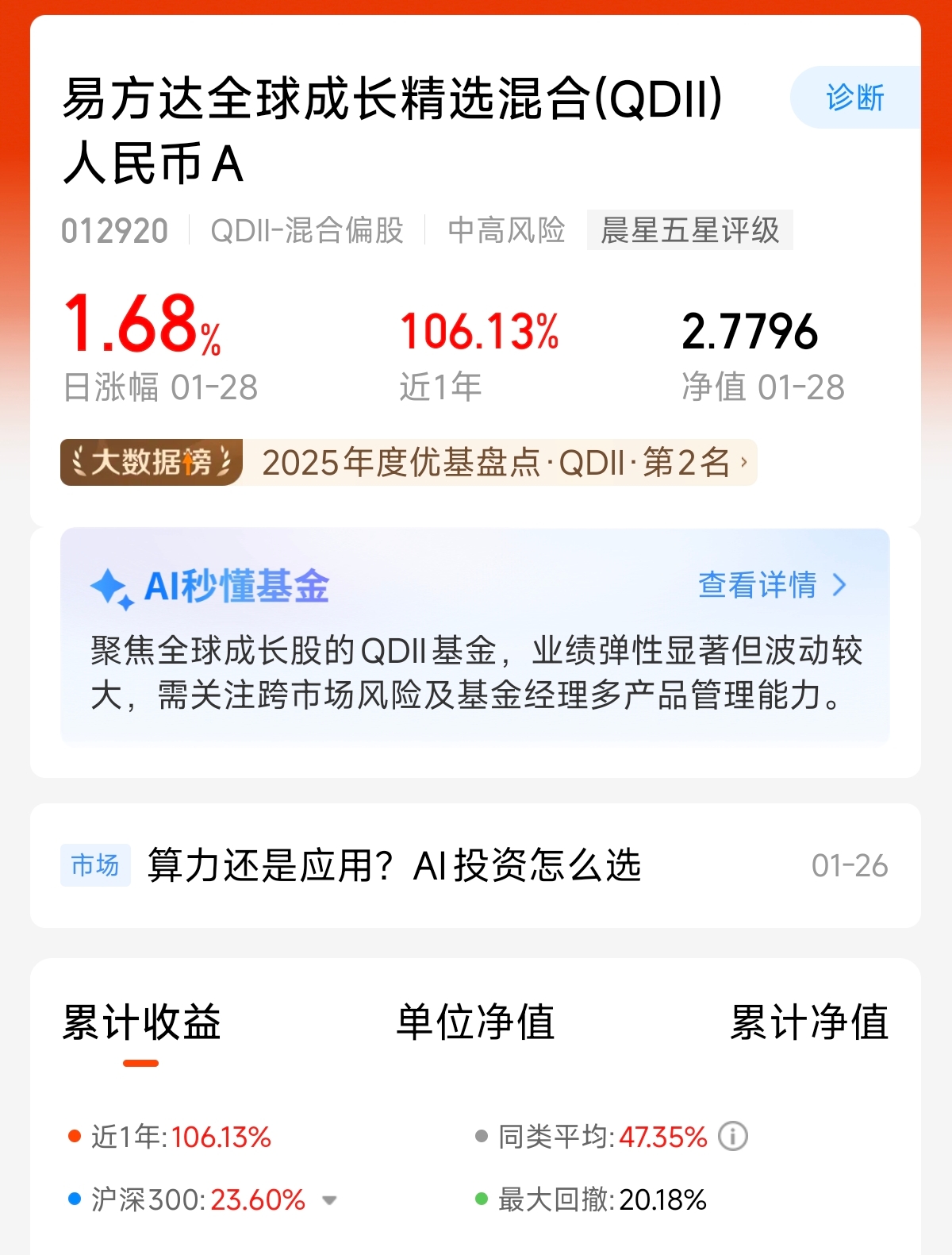 美联储降息周期持续,全球科技类资产有望受益,AI应用持续发展,今天CPO大涨,我持仓的$易方达全球成长精选混合(QDII)人民币A(OTCFUND|012920)$,之前布局全球科技,就领涨,第四季度加仓CPO占前十大的24%,这基金经理眼光太独到了,持仓体验不错呢。