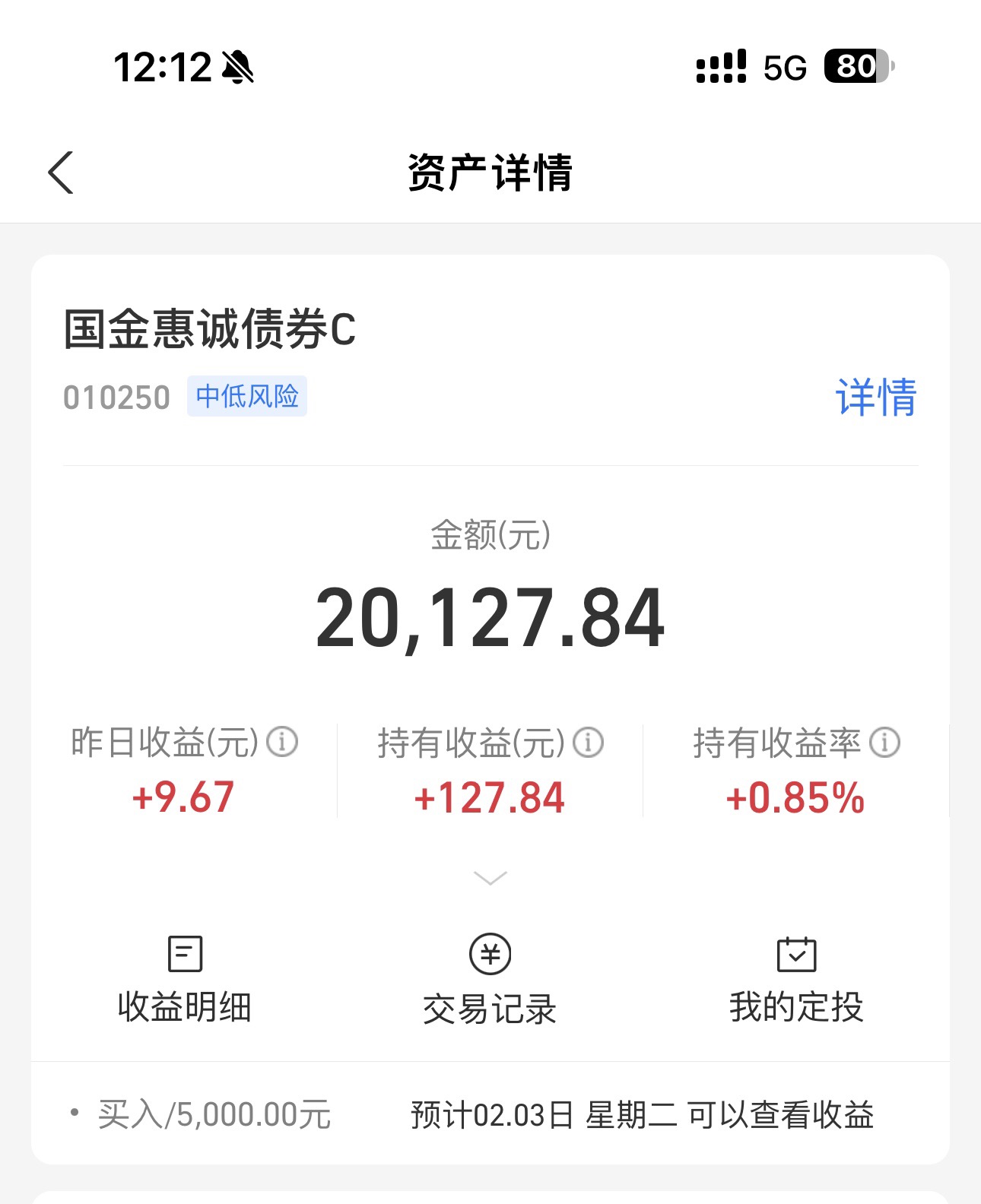 $国金惠诚债券C$ ;小王今日上车5000,今天大盘回调幅度比较大,小王觉得目前慢牛的趋势没有改变,所以回调反而是给我重新上车的机会,前期小王已经成功吃肉,那么回调我就继续上车一笔啦;从最新的四季度持仓数据来看,该基金的资产配置呈现出科学均衡的布局思路,53.22%的信用债与23.11%的利率债构成核心底仓,基金经理再巧妙配置15.81%的股票仓位与10.56%的可转债仓位去进攻收益,股票仓位精准捕捉权益市场的成长红利,而可转债则依托“债性兜底、股性增值”的独特优势,在把握收益机遇的同时灵活平衡风险,所以给我的感觉也是涨得多碎得少的基金类型;并且拉开长期收益来看:近一年的收益率已经达到了7.97,所以我也能接受适当的波动,所以今日我趁着回调就准备继续加一笔,低吸不追涨也是我的态度