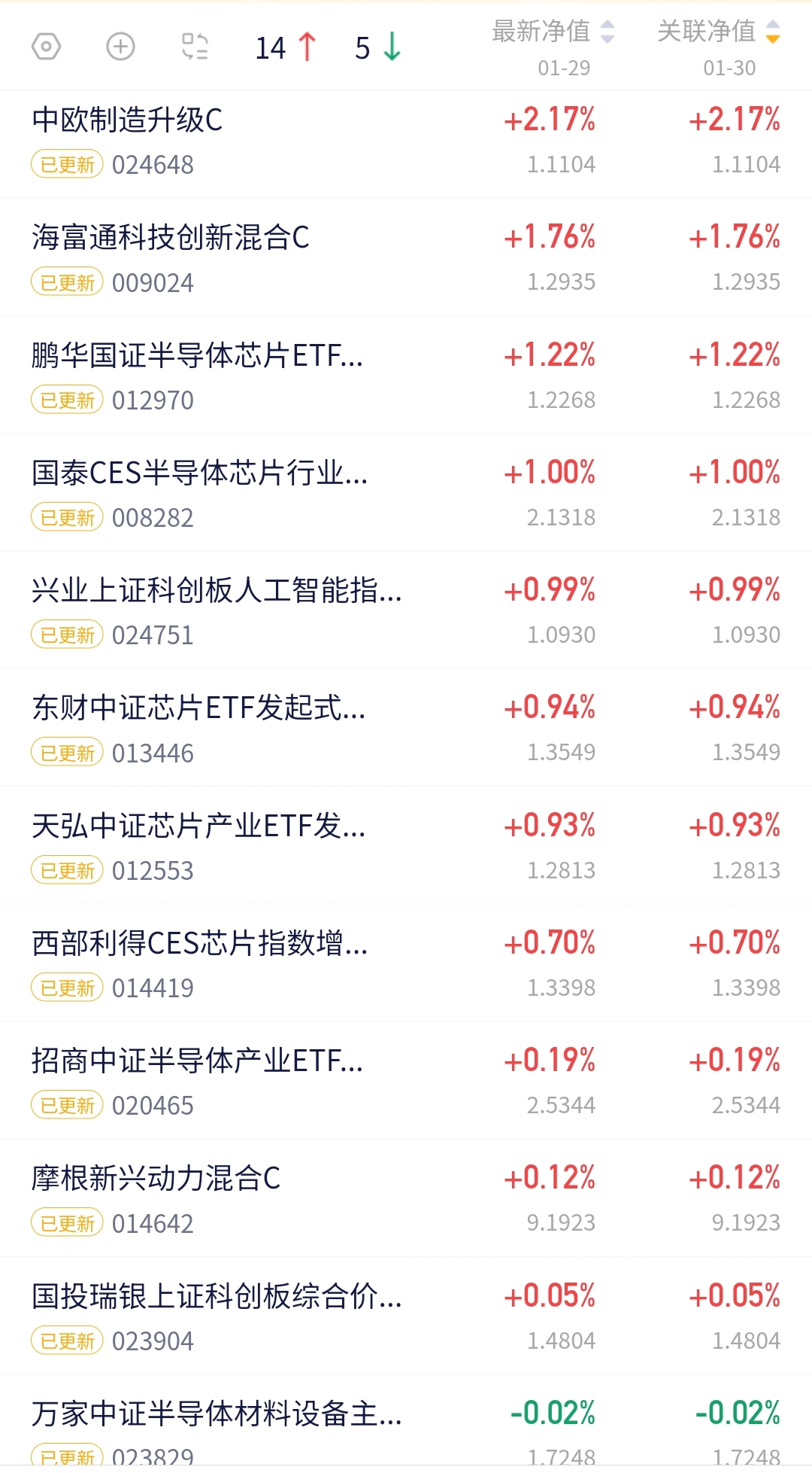 1月整体还是可以的咯~感觉春节行情科技赛道依旧值得期待~我看中-欧制造升级C今天收涨2.17%。