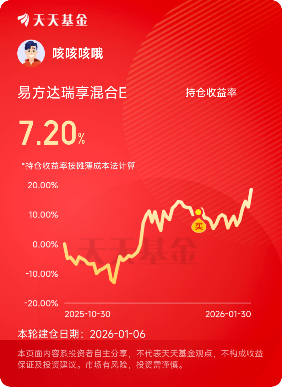 在我看来,投资不是比谁短期赚得多,而是比谁能在长期里持续跑赢市场。2025年的超额收益让我更加坚信,没有复杂的技巧,也不需要精准择时,只要坚持“核心打底+卫星进攻”的配置,用耐心和纪律对抗市场情绪,就能在波动中收获稳稳的幸福。2026年,我已经准备好了和易方达瑞享混合E一起,继续在这条稳健增值的路上走下去。