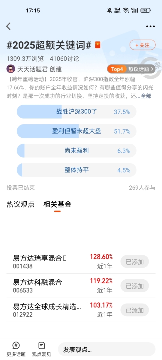 2025年的市场并非一帆风顺,年中曾出现大幅回调,身边不少朋友因高杠杆或追涨杀跌而损失惨重。而我因为始终坚持“稳健跟随”的纪律,不仅守住了本金,还在年底收获了超出预期的回报。这让我深刻体会到:在基金投资中,慢即是快,守正才能出奇。超额收益往往不属于最聪明的人,而属于最有耐心、最守纪律的人。@易方达基金 $易方达科技创新混合A$ $易方达裕鑫债券A$ $易方达科融混合$