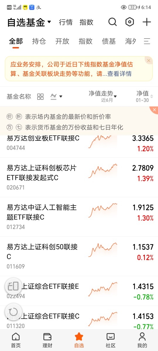 $易方达创业板ETF联接C$ $易方达上证科创板芯片ETF联接发起式C$ $易方达中证人工智能主题ETF联接C$ $易方达上证科创50联接C$ $易方达国证机器人产业ETF$ $易方达中证沪深港黄金产业股票指数发起式A$ $易方达上证科创板芯片ETF联接发起式A$