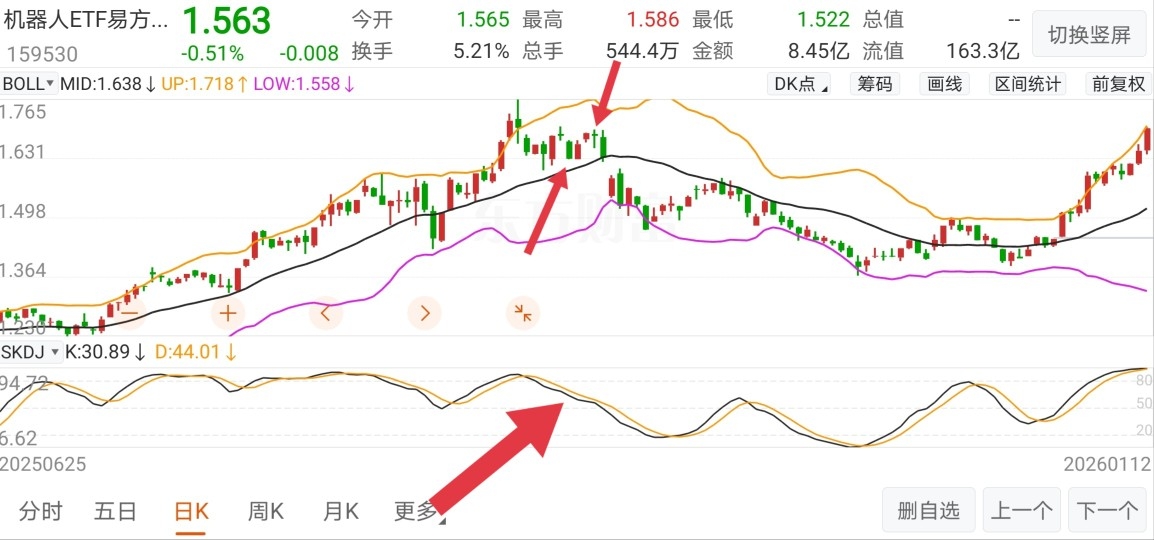 技术面上,机器人E在前期经历了快速上涨后,16日突破了布林线上轨,其他指标比如慢速KD指标也都超买,这都是明显的顶部信号,然而虽然调整了一周多,我入场时,布林线开口还处于扩张的状态,慢速KD指标也还在60以上的高位!并没有经历充分的调整,获利盘还非常丰厚!虽然我1.634进入后连续反弹了两天,涨到了1.689,但是慢速KD指标并没有返身向上金叉,反而继续向下滑落。我感觉大事不妙,这两天的反弹是假象。再加上节日期间海外市场的一些科技股出现了调整,这也对国内的机器人板块产生情绪上的影响,使我更加确信我冲动下选择了错误的中线入场时机。